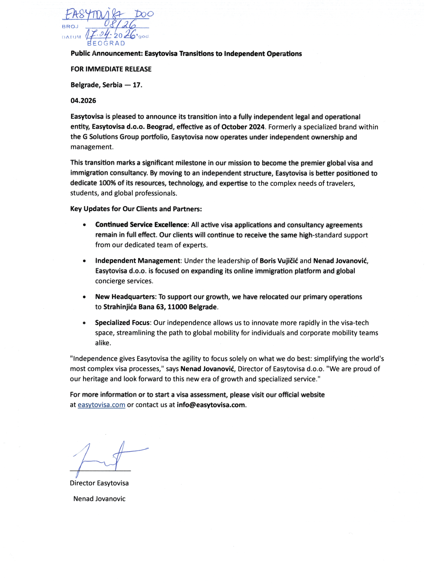 Easytovisa is pleased to announce its transition into a fully independent legal and operational entity, Easytovisa d.o.o. Beograd, effective as of October 2024. Formerly a specialized brand within the G Solutions Group portfolio, Easytovisa now operates under independent ownership and management.